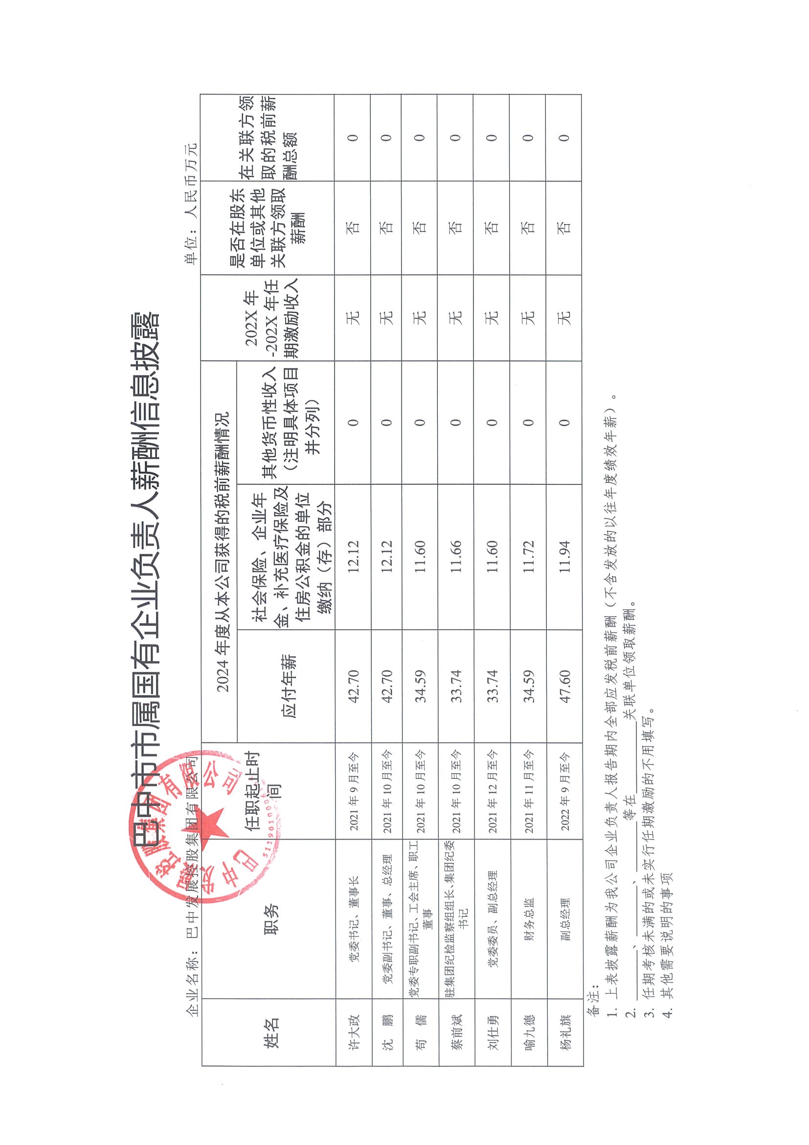 巴中市市屬國有企業(yè)負責人薪酬信息披露